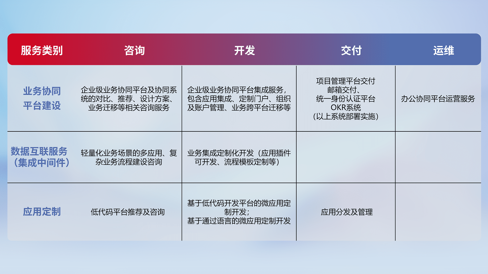针对钉钉、、、、企微、、、IDaas等平台级产品提供产品的规划、、、方案、、、、交付、、、定制化开发等服务,,实现如统一协同办公、、智能客户服务、、混合会议管理、、、智能数据查询、、、等业务场景,,,实现数字化转型。。