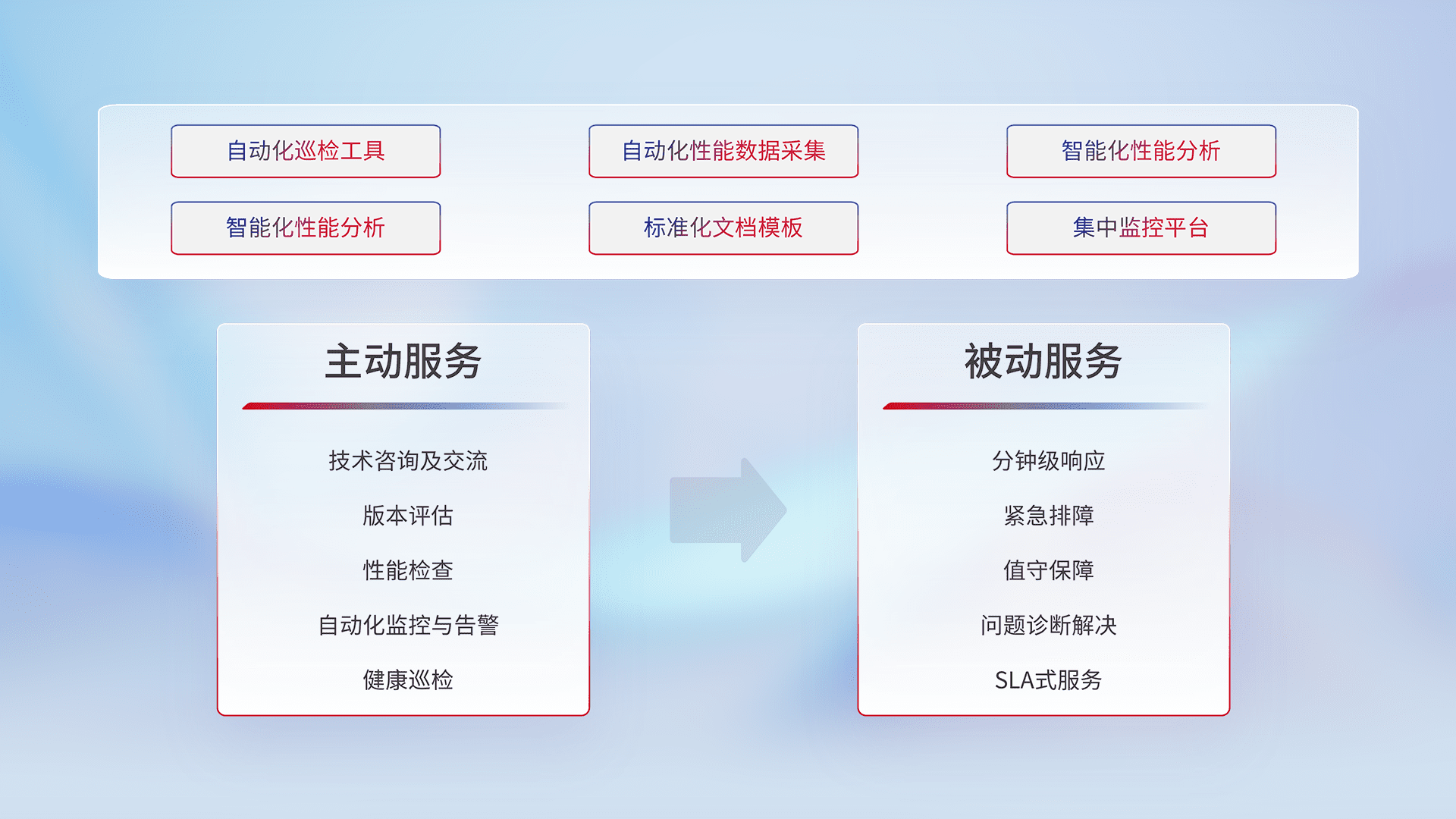 智能化工具和标准化文档,,保障服务质量,,,提供主动服务(包含技术咨询、、、、版本评估、、性能检查、、、自动化监控与告警、、、健康巡检)和被动服务包含(分钟级响应、、、紧急排障、、、、值守保障、、、问题诊断解决、、SLA服务)。。。。